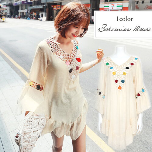 【ネコポスOK】オーバーウェア 水着の上 体型カバー出来る マルチカラー クロシェ ブラウス 大きいサイズ 水着の上に着る カバーアップ 五分袖 かぎ編みレース レディース 20代/30代/40代/春/夏/秋/キナリ/アイボリー/ベージュ/フリーサイズ