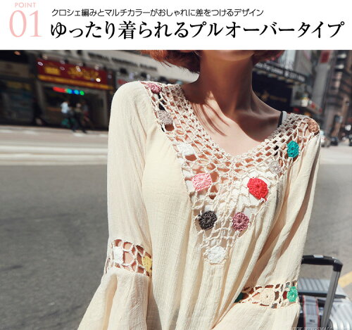 サイズ(約cm) フリーサイズ 総丈 95 肩幅 43.5 バスト 90 ウエスト 100 袖丈 38 素材 綿30-50% 麻 50-70% 備考 ・透け感:あり ・伸縮性:なし ・生産国:中国 注意点 ▼クロシェ編みのマルチカラー部分の色はランダムのため、上記写真の色配置とは異なる場合がございます。